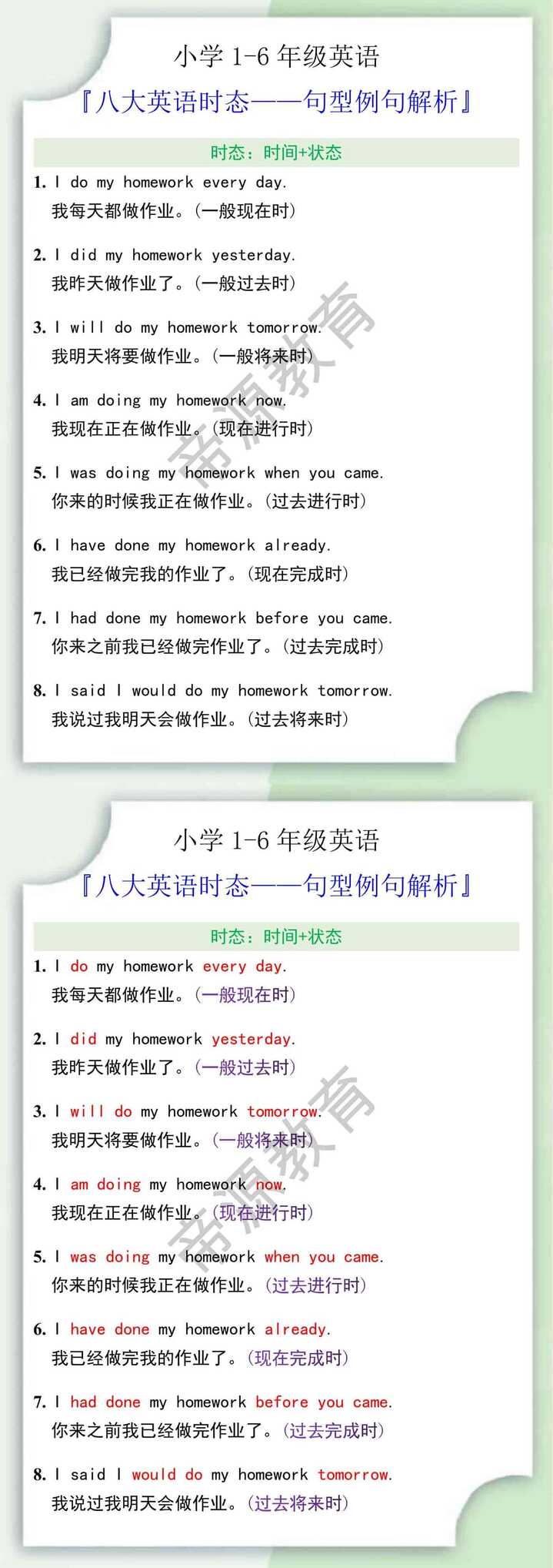 时态:时间+状态 1.I do my homework every day. 我每天都做作业。(一般现在时) 2.I did my homework yesterday. 我昨天做作业了。(一般过去时) 3.I will do my homework tomorrow. 我明天将要做作业。(一般将来时) 4.I am doing my homework now. 我现在正在做作业。(现在进行时) 5.I was doing my homework when you came. 你来的时候我正在做作业。(过去进行时) 6.I have done my homework already. 我已经做完我的作业了。(现在完成时) 7.I had done my homework before you came. 你来之前我已经做完作业了。(过去完成时) 8.I said I would do my homework tomorrow. 我说过我明天会做作业。(过去将来时)