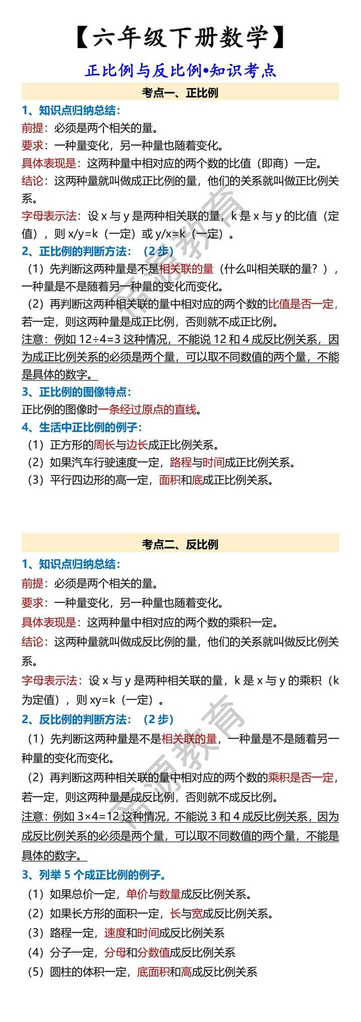 考点一、正比例 1、知识点归纳总结: 前提:必须是两个相关的量。 要求:一种量变化,另一种量也随着变化。 具体表现是:这两种量中相对应的两个数的比值(即商)一定。 结论:这两种量就叫做成正比例的量,他们的关系就叫做正比例关系。 字母表示法:设x与y是两种相关联的量,k是x与y的比值(定值),则x/y=k(一定)或y/x=k(一定)。 2、正比例的判断方法:(2步) (1)先判断这两种量是不是相关联的量(什么叫相关联的量?),一种量是不是随着另一种量的变化而变化。 (2)再判断这两种相关联的量中相对应的两个数的比值是否一定,若一定,则这两种量是成正比例,否则就不成正比例。 注意:例如12÷4=3这种情况,不能说12和4成反比例关系,因为成正比例关系的必须是两个量,可以取不同数值的两个量,不能是具体的数字。 3、正比例的图像特点: 正比例的图像时一条经过原点的直线。 4、生活中正比例的例子:
