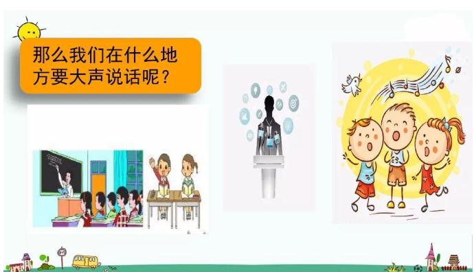 (课件出示7)出示各种场景的图片,如公交车上、电影院里、餐厅里、演讲比赛中,让学生看图选择声音的大小...