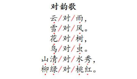 《对韵歌》共3句。第一、二两句以单字对的形式,包罗自然现象“云、雨、雪、风”和动植物“花、树、鸟、虫...